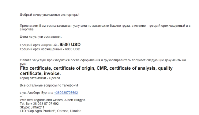 "Это письмо было разослано на электронные почты украинских экспортеров ореха. В нем иностранный инвестор предлагает другим участникам варианты выхода из ситуации, в том числе - не платить на таможне прокладкам, а платить напрямую правительству $5 тысяч с машины орехов"