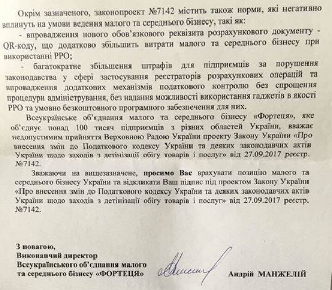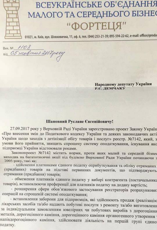 У Листі Всеукраїнського об’єднання малого та середнього бізнесу "Фортеця" висловлено прохання відкликати підписи народних депутатів-авторів проекту закону №7142 "Про внесення змін до Податкового кодексу України та деяких законодавчих актів України щодо заходів з детінізації обігу товарів і послуг" (далі – проект закону).