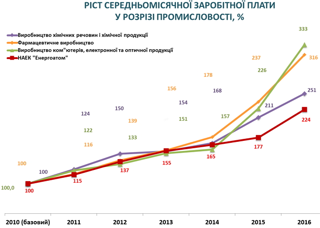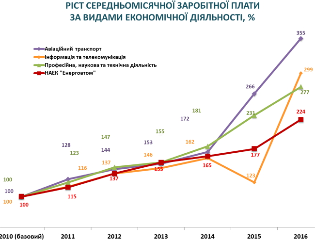 В качестве иллюстраций – динамика роста заработной платы по отраслям украинской экономки, явно видно, что ядерная энергетика "пасет задних" по зарплатам.