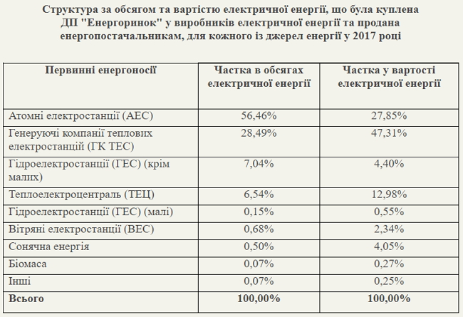 Вот и госпредприятие "Энергорынок" опубликовало информацию "Структура по объему и стоимости электрической энергии, которая была куплена ГП "Энергорынок" у производителей электроэнергии для каждого из источников энергии в 2017 году".
