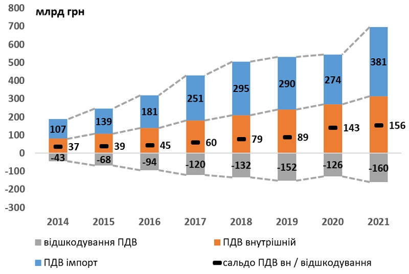 Вітчизняний ПДВ сьогодні є нічим іншим як податком на міжнародну торгівлю. Приріст від сплати ПДВ за імпортними товарами сягає критичного співвідношення з сальдо надходжень по внутрішньому (дивись графік).