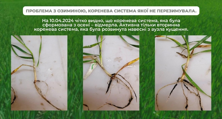 На початку квітня до нас звернулись аграрії з Дніпропетровщини: вони викопали рослини і прислали нам фото із питанням: "Що можна зробити?" Знову-таки, там була проблема розвитку кореневої системи. Видно, що кореня немає (він може бути візуально, але це не повноцінна коренева система). Ситуацію нам вдалося виправити, і на сьогоднішній день там зовсім інша озимина, тому що якраз добавилось три-чотири тижні вегетації.