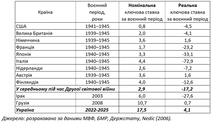 Такий рівень ставок центрального банку є своєрідним рекордом для воюючої країни. Так, реальна ключова ставка під час війни становила "плюс" 0,7% у Грузії 2008 році та "мінус" 17,2% у середньому в країнах Європи, США та Японії під час Другої світової війни. В Україні в середньому за 2022 – серпень 2025-го реальна ключова ставка дорівнювала "плюс" 4,1% річних.