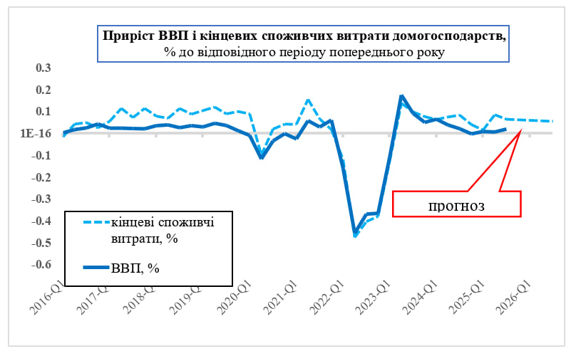 Очікуване річне зростання реального ВВП за 2025 рік на рівні 2%, за експертним консенсусом, збережеться також у 2026 році. Звісно, основний негативний фактор такого кволого росту вітчизняного ВВП – війна.