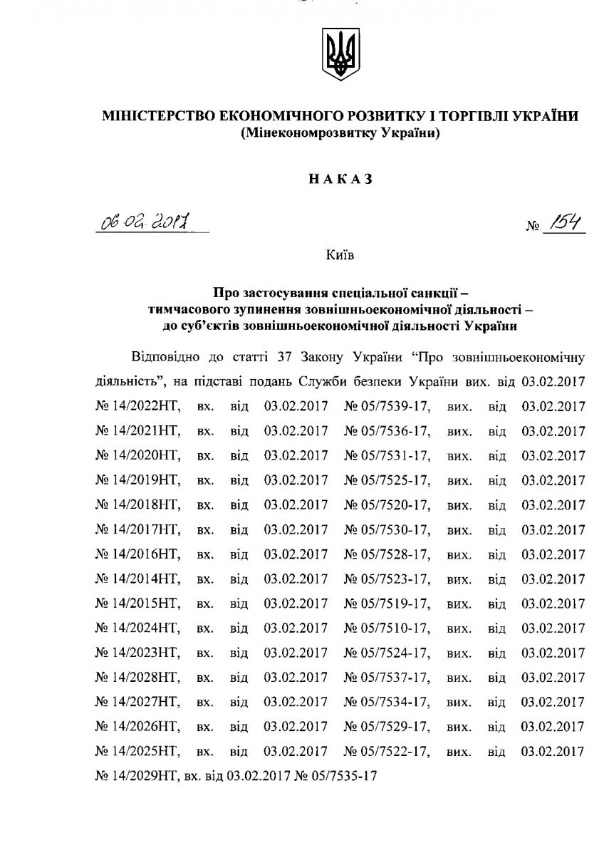 Другим своим приказом – №155 – Минэкономразвития также ввело запрет на деятельность восьми компаний-нерезидентов. Основанием для санкций, согласно дополнению к указу, также служат материалы СБУ, поступившие 3 февраля 2017 года.