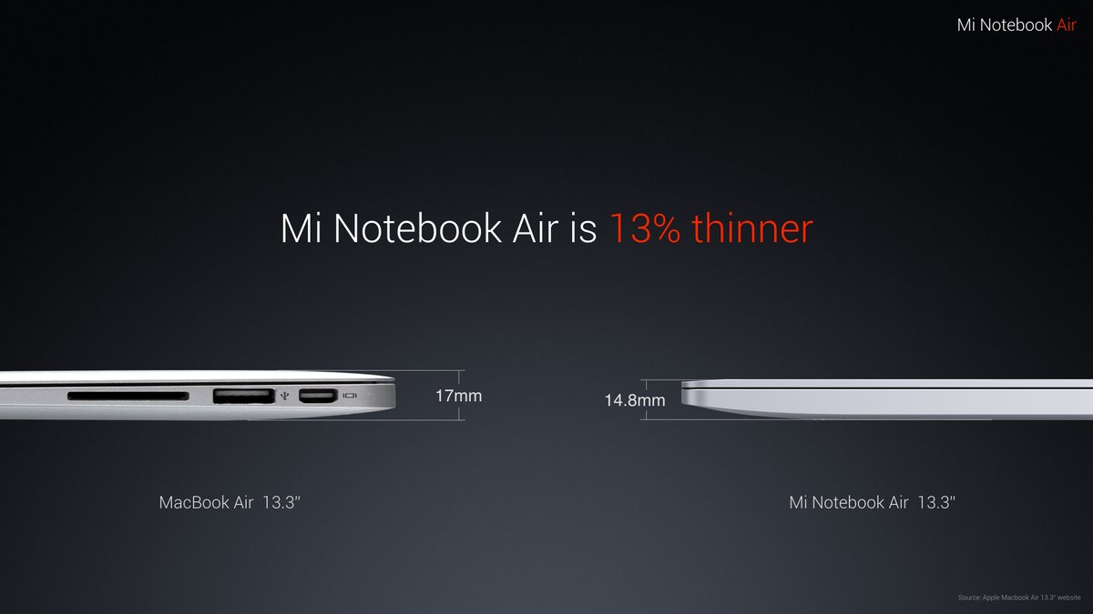 Устройства оснащены портами HDMI, USB 3.0, USB Type-C и 3,5 мм. Корпус обеих моделей выполнен из металла. Как утверждают в компании, ноутбук на 13% тоньше MacBook Air в том же формате 13,3. Продажи Mi Notebook Air в Китае начнутся 2 августа.