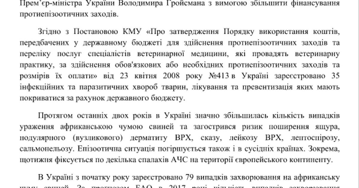 "На сегодня проект Государственного бюджета на 2017 год в том виде, в котором он принят в первом чтении Верховной Радой Украины, будет провоцировать ухудшение в агросекторе, в частности, эпизоотической ситуации", – говорится в обращении.
