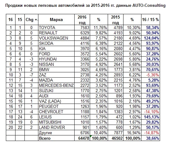По данным AUTO-Consulting, лидером рынка новых автомобилей с долей рынка 11,76% (в 2015 году -10,3%) стала Toyota, которой удалось нарастить продажи на 58% - до 7 583 единиц.