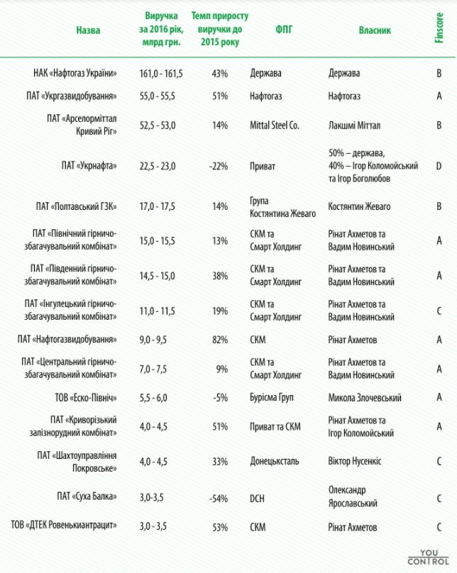 В список вошли 15 сырьевых компаний-лидеров по полученной выручкой за 2015-2016 годы. В него вошли компании, которые занимаются добычей железной руды и угля. Среди их владельцев Костятин Жеваго, Ринат Ахметов и Вадим Новинский.