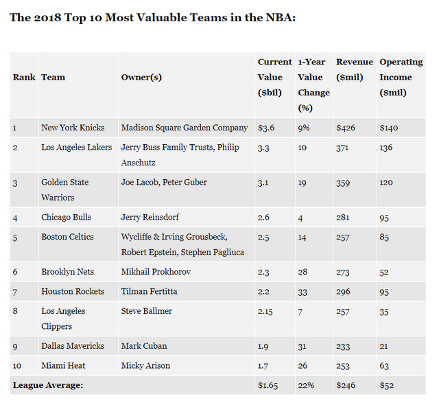 В частности, Нью-Йорк Никс третий год подряд остаются самой дорогой франшизой. Стоимость клуба оценивается в $3,6 млрд.