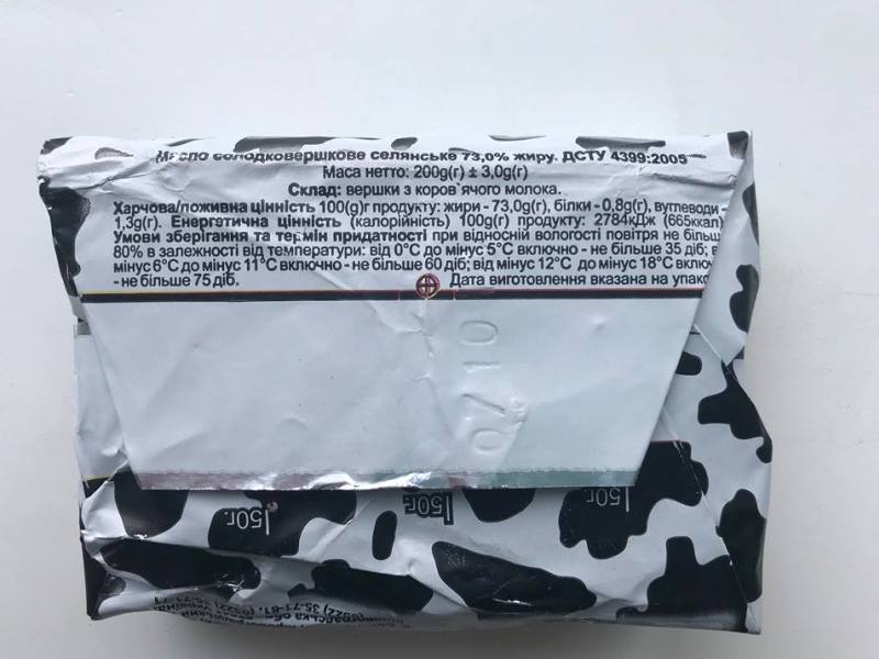 Так, на упаковке масла сладкосливочного с содержанием жира 73% его производителем указано ООО "Молочный комбинат Соколоський" (орфография сохранена), производительные мощности которого расположены в с. Соколовское Кировоградского района.