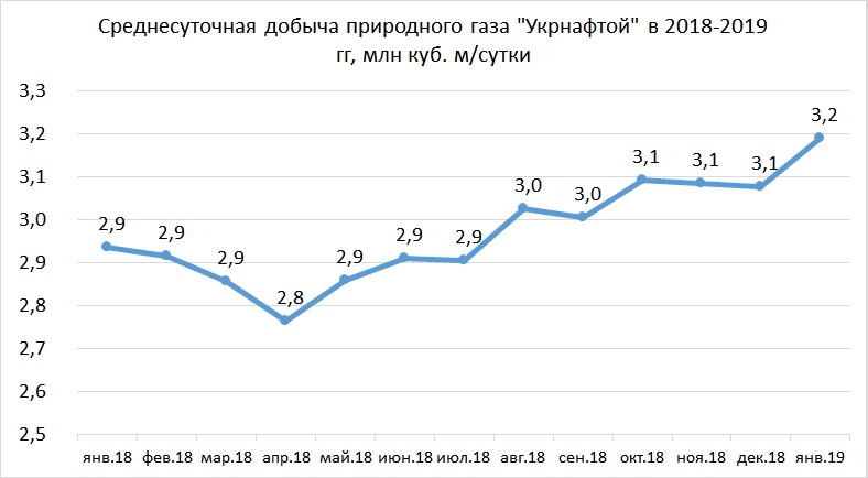 Среднесуточная добыча "Укрнафты" в январе составила 3,19 млн кубометров, что на 3,7% превышает уровень декабря 2018 годп. В январе 2019 года нефтедобывающая компания добыла 98,86 млн кубометров газа. По сравнению с январем 2018 года добыча повысилась на 8,6% (на 7,8 млн кубометров).