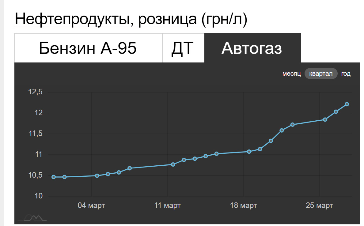 Сейчас на странице ЦензорБиржа отображаются данные о розничных ценах на моторное топливо, оптовые цены на природный газ на украинской бирже и на крупнейших европейских площадках (с учетом доставки до границы с Украиной), а также оптовые цены на сжиженный газ.