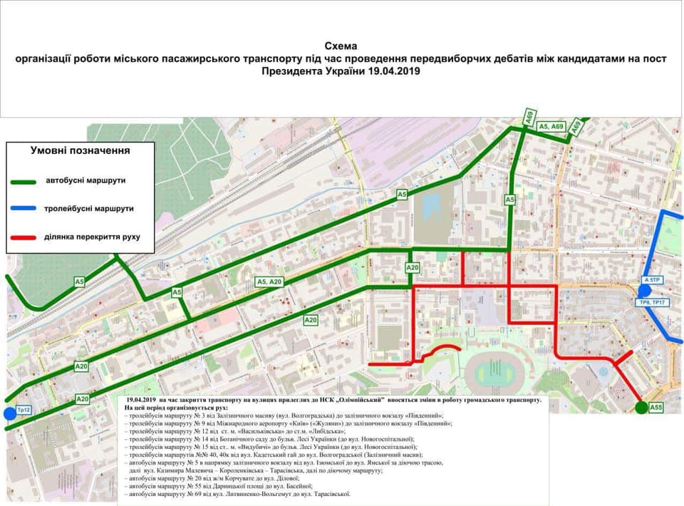 В Киеве 19 апреля в связи с проведением дебатов на НСК "Олимпийский" между кандидатами в президенты Украины Владимиром Зеленским и Петром Порошенко изменятся маршруты движения городского транспорта.
