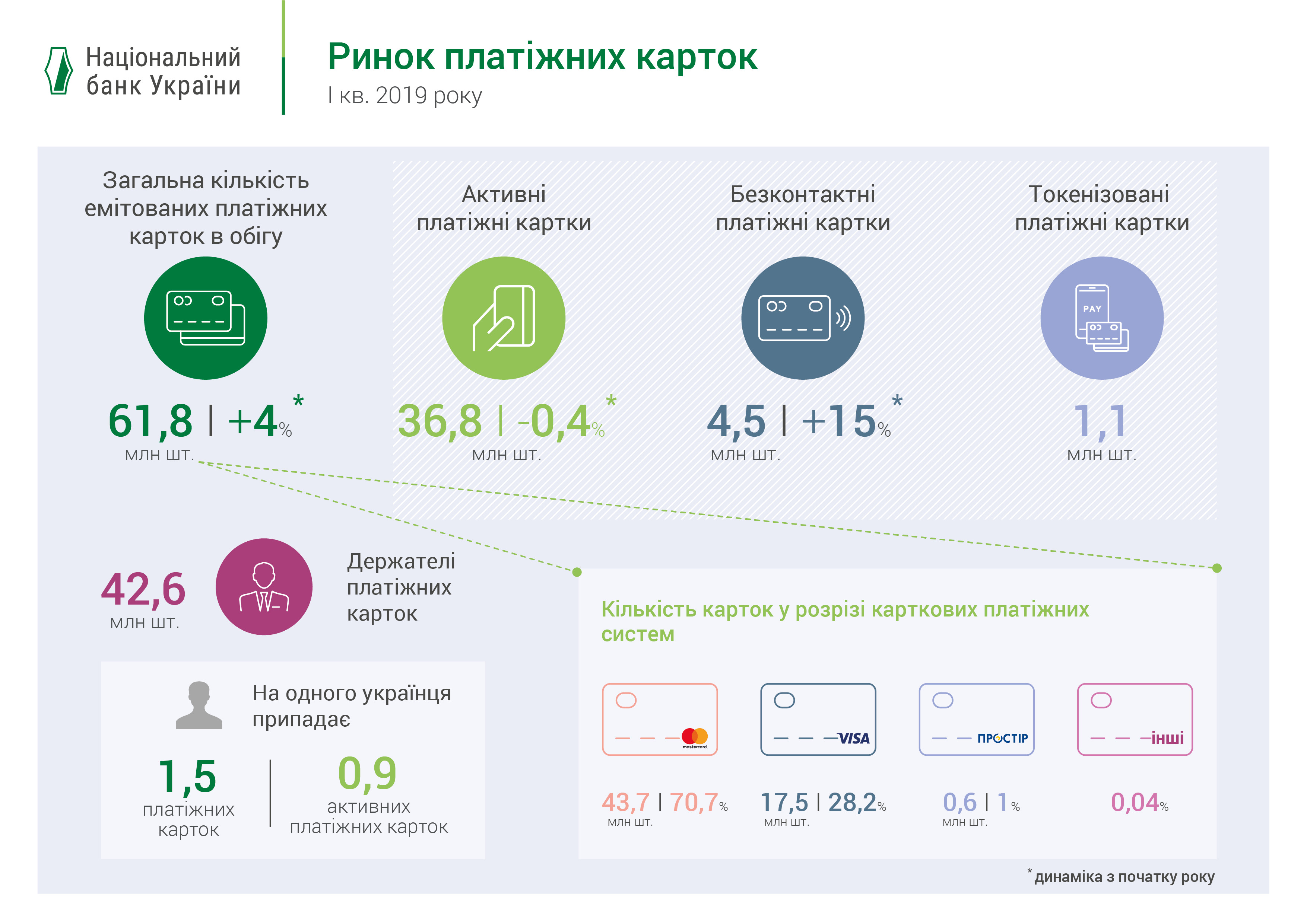 По данным НБУ, за первые три месяца 2019 года общее количество платежных карточек в Украине выросло на 4% до 61,8 млн шт. (из них 60% – активные). В то же время количество бесконтактных активных платежных карточек за этот период выросло на 15% – до 4,5 млн шт. Таким образом, каждая восьмая активная платежная карточка - бесконтактная.