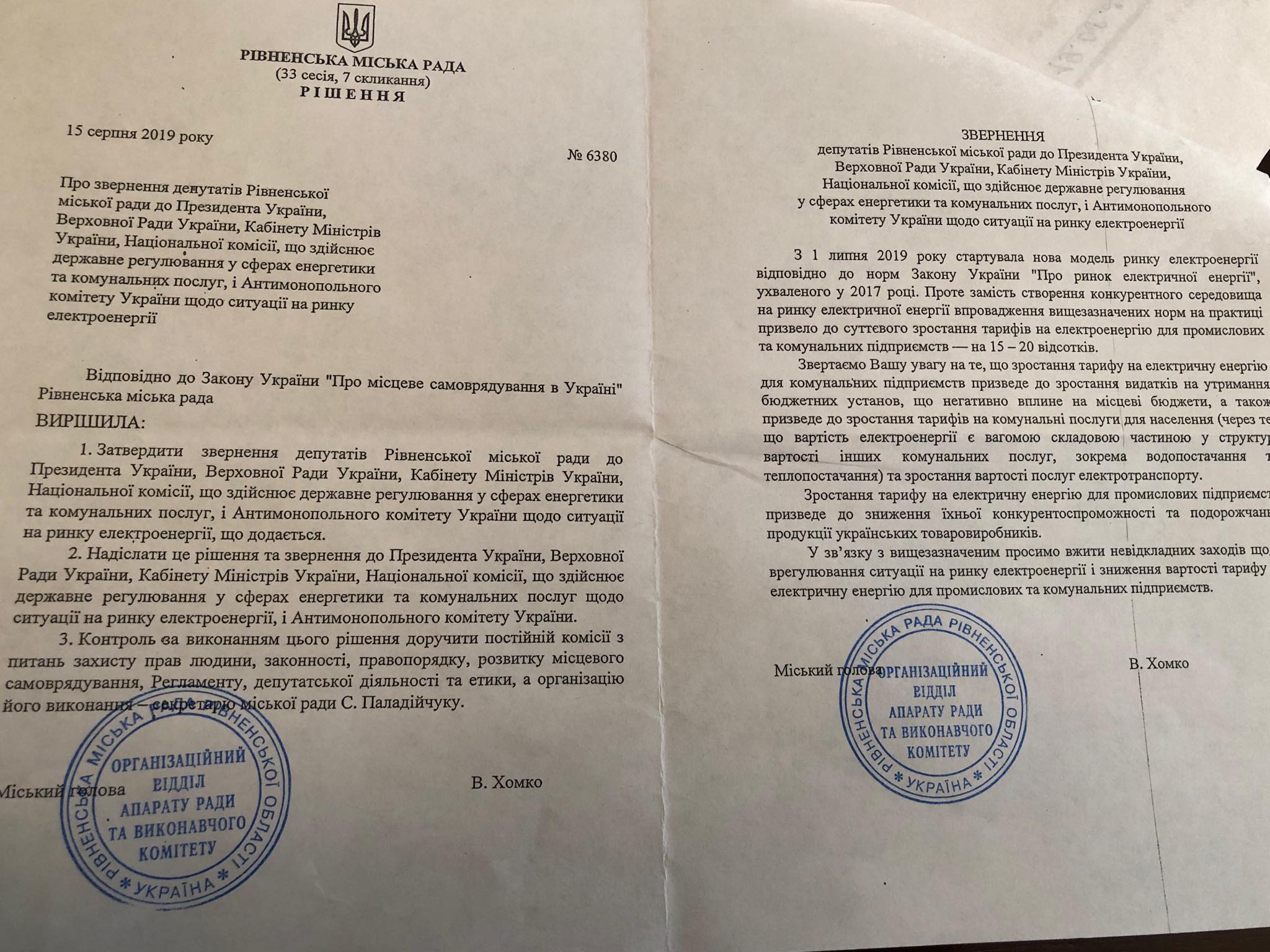 Городской совет Ривного призывает предпринять неотложные меры для снижения тарифов на электрическую энергию для промышленных и коммунальных предприятий.