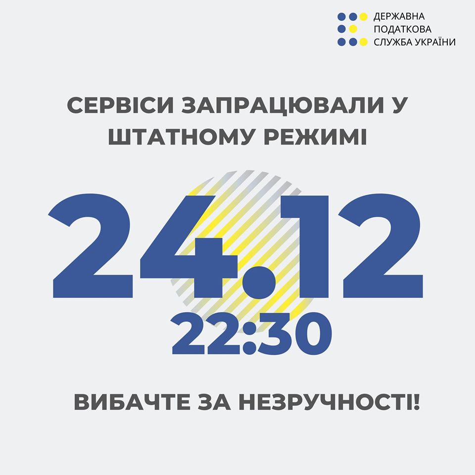 Государственная налоговая служба Украины сообщает, что в работе электронных сервисов службы произошел сбой, но сейчас они работают в штатном режиме.