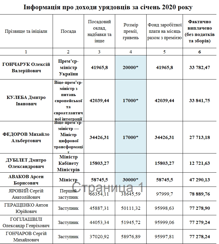Так премьер-министр Алексей Гончарук получил в январе после уплаты налогов 33,78 тыс. грн, также ему начислено 20 тыс. грн премии.
