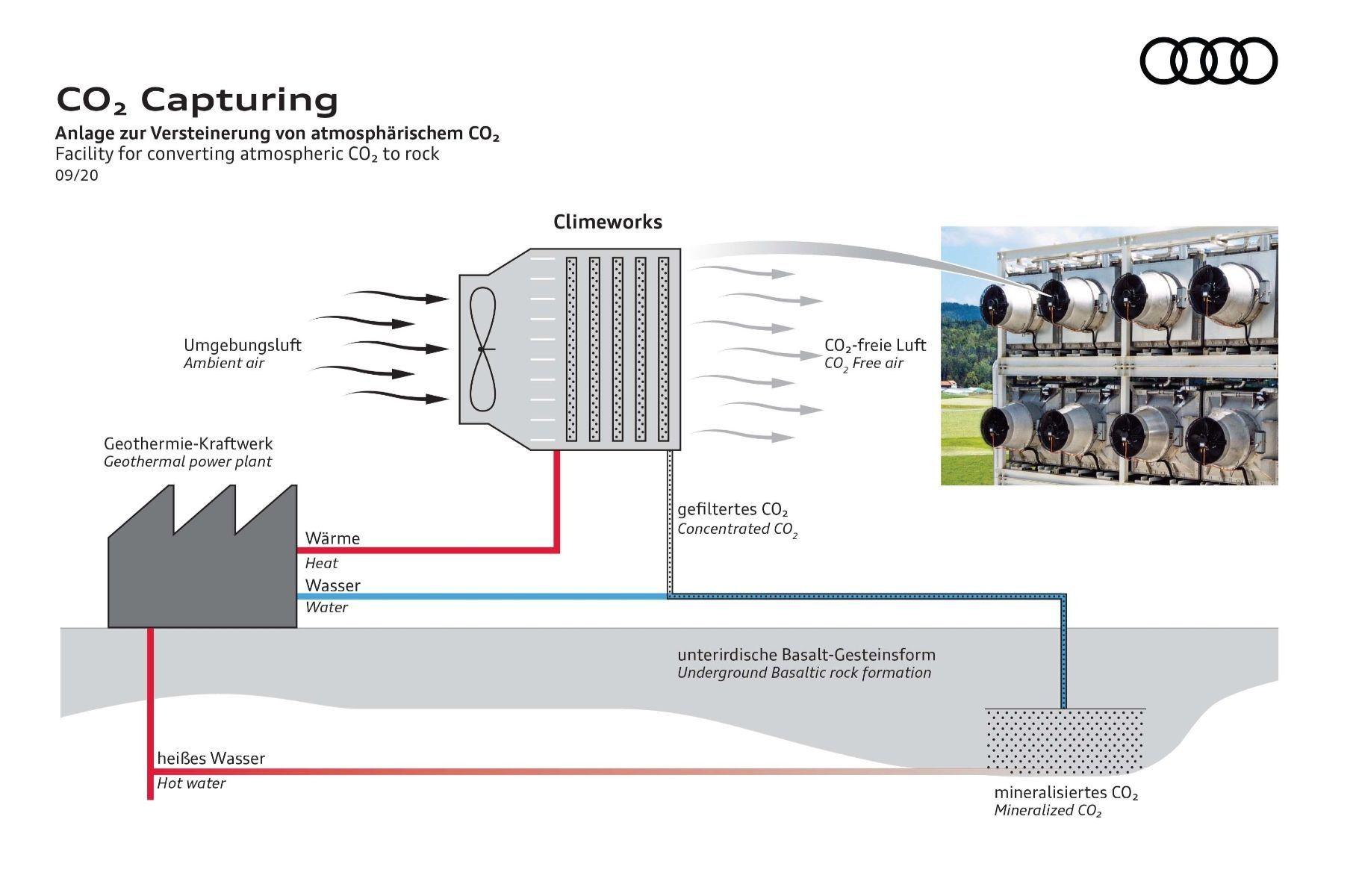 Audi сотрудничает с экологическим стартапом Climeworks с 2013 года. Два года назад компании построили в Хинвиле, Швейцария, объект, который фильтрует CO2 из воздуха, а затем превращает в углекислоту для промышленного производства напитков. Установка в Исландии - это новый этап этого сотрудничества. Вкладом Audi в этот проект являются технологические ноу-хау, например, в разработке новых концепций теплообменников.