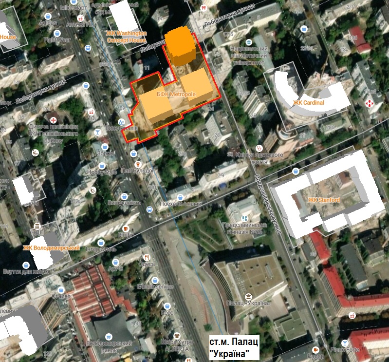 По указанному адресу на участках общей площадью 1,15 га строится многофункциональный комплекс Metropole. Из них 0,83 га находятся в частной собственности застройщика, а 0,32 га – в коммунальной.