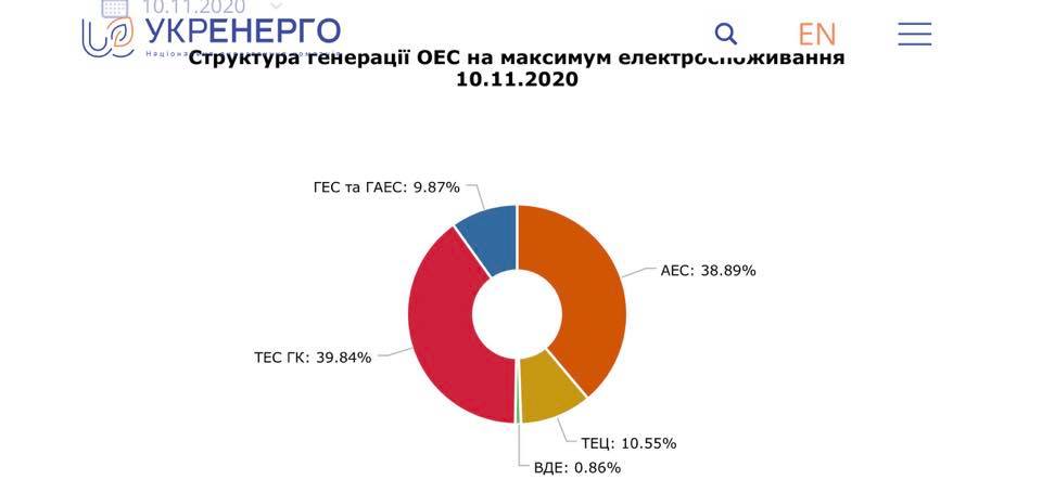 В объединенной энергосистеме Украины (ОЭС) 10 ноября производство электроэнергии тепловыми станциями (ТЭС) в часы пиковой нагрузки превысило генерацию атомных станций НАЭК "Энергоатом".