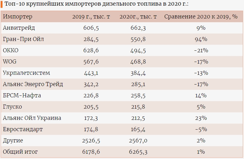 По итогам 2020 года крупнейшим импортерам дизтоплива в Украину стала компания "Анвитрейд" (входит в Wexler Group), увеличив поставки на 9%, по сравнению с 2019 годом, – до 662,3 тыс. тонн.