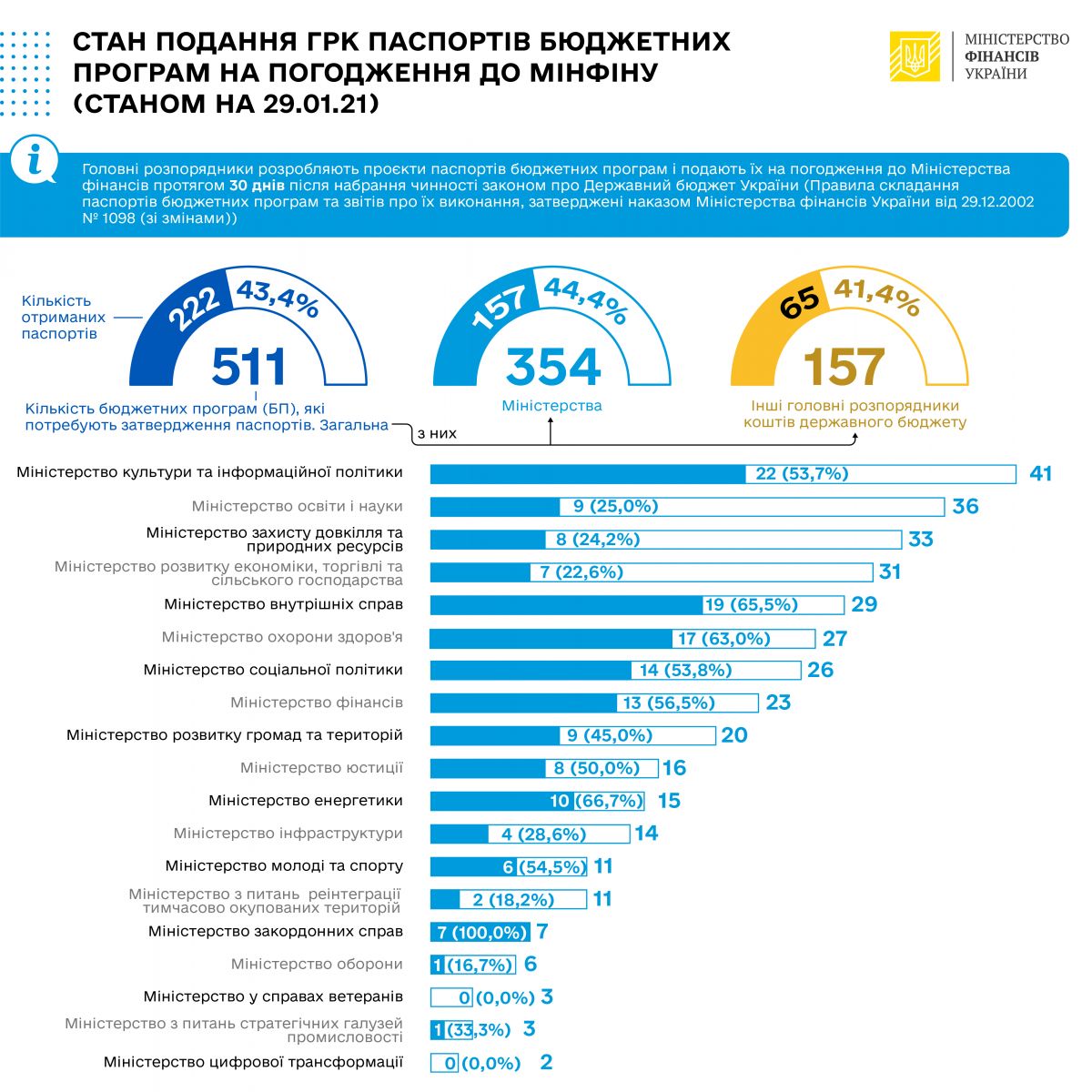 По состоянию на 29 января 2021 из 511 бюджетных программ, требующих утверждения паспортов в текущем году, в Министерство финансов на согласование поступило 222, в том числе от министерств 157 паспортов, других главных распорядителей средств государственного бюджета - 65.
