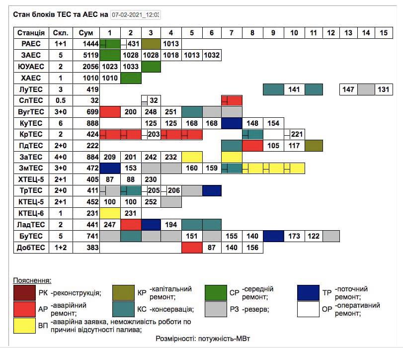 По состоянию на 12:00 воскресения, 7 февраля, в объединенной энергосистеме Украины в аварийном ремонте находится 9 энергоблоков.