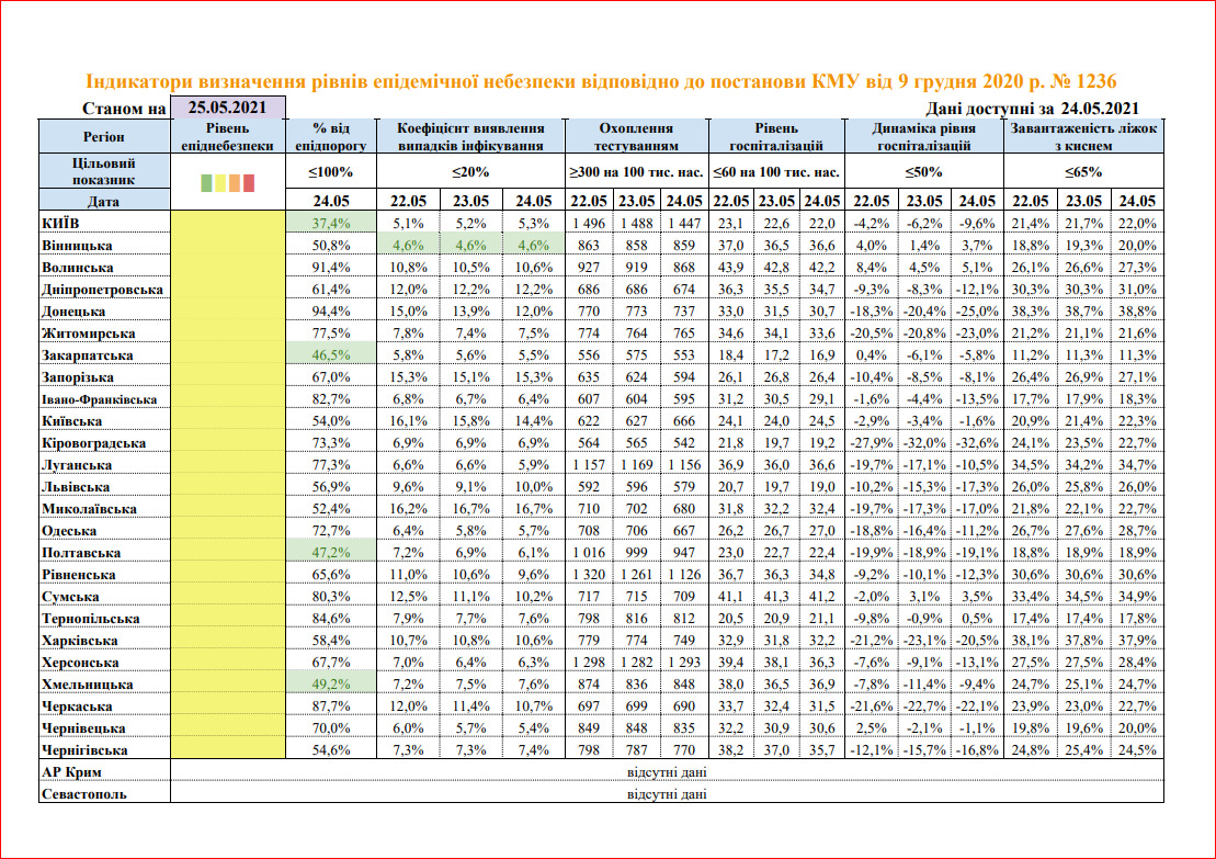 По состоянию на 25 мая карантинные ограничения во всех областях Украины соответствуют "желтому" уровню эпидемической опасности распространения коронавирусной болезни COVID-19.