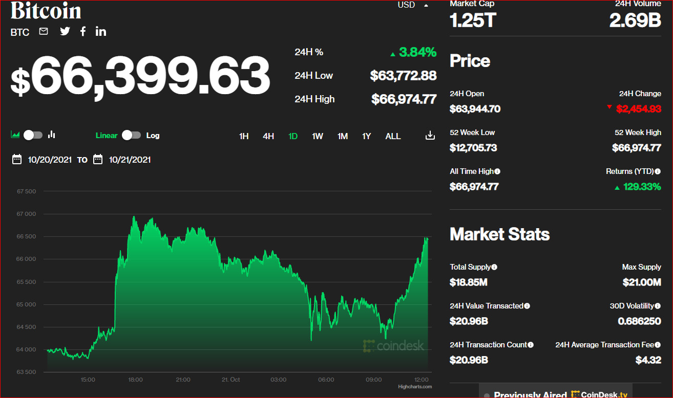 Стоимость криптовалюты Bitcoin обновила исторический рекорд, достигнув 20 октября $66 974 за одну монету.