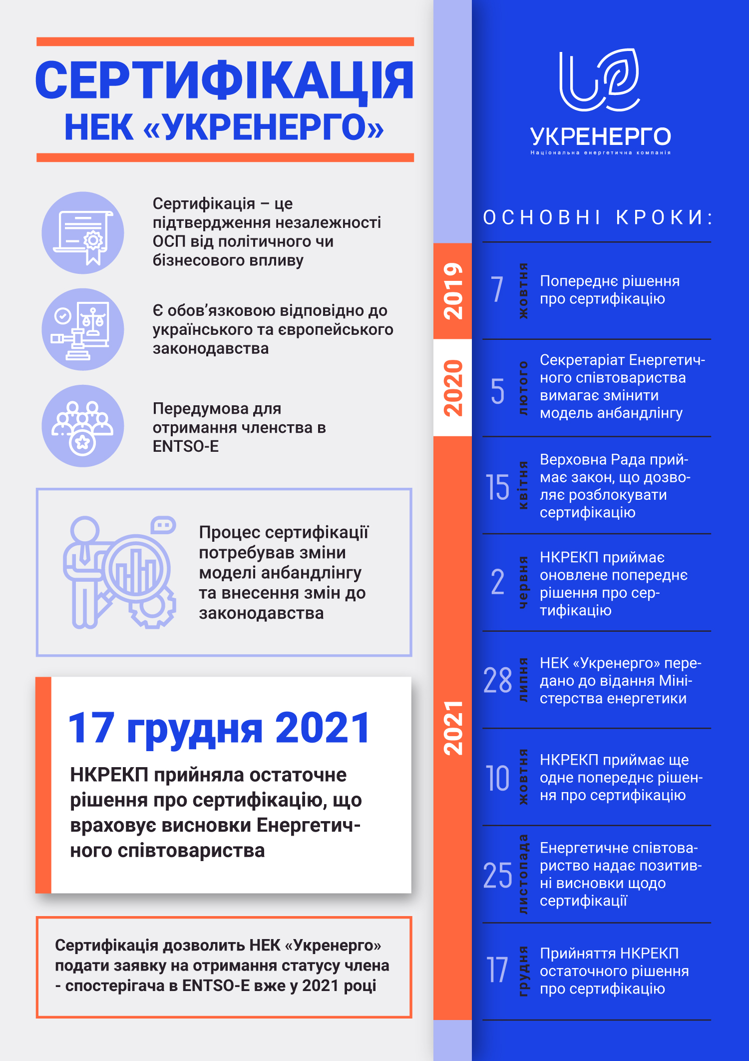 Нацкомісія, що здійснює державне регулювання у сферах енергетики та комунальних послуг (НКРЕКП), сертифікувала НЕК "Укренерго" як оператора системи передачі європейського зразка за моделлю ISO, що є обов'язковим кроком на шляху до інтеграції енергосистеми України до європейської.