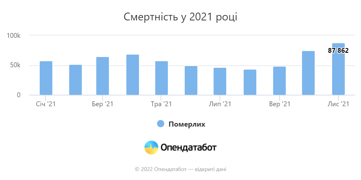 Зокрема, у листопаді минулого року померли майже 88 тисяч українців – це рекордна кількість не лише за час пандемії, а й загалом за період з 2013 року. В тому числі вiд коронавiрусу померло майже 22 тис. осіб – це 25% вiд загальної кількості смертей.