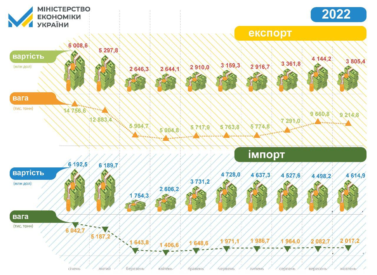Загалом за результатами 10 місяців загальний торгівельний оборот склав $80,3 млрд, з яких $36,9 млрд припадає на експорт і $43,4 млрд – на імпорт. У порівнянні до аналогічного періоду минулого року український експорт зменшився на 32,3%, а імпорт – лише на 23,9%.