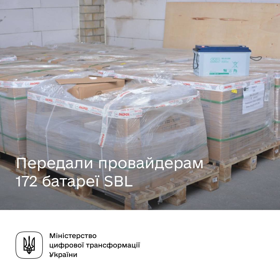 Міністерство цифрової трансформації України спільно з eQualitie передали провайдерам 172 батареї SBL. Завдяки цьому українці матимуть інтернет протягом 10-12 годин після відключень світла.