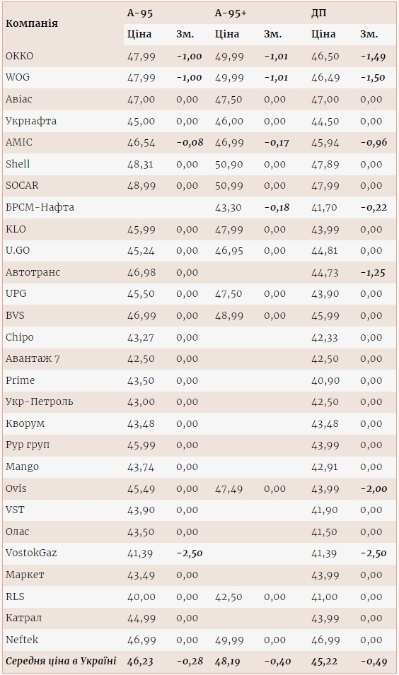 Зокрема, на станціях ОККО і WOG дизельне пальне подешевшало одразу на 1,49 і 1,50 грн – до 46,50 і 46,29 грн за літр відповідно. Ціни на бензини А-95 у цих мережах знизили на 1 гривню за літр.
