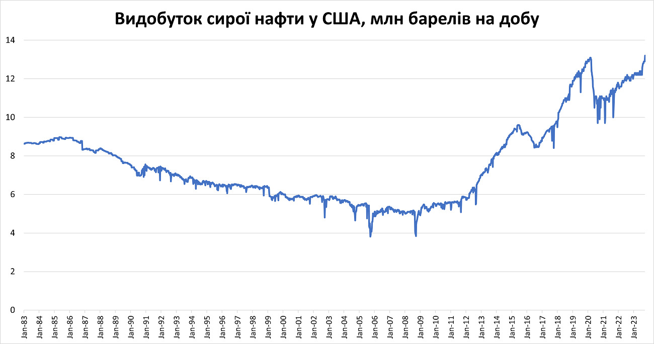 Видобуток сирої нафти у США зріс до рекордних за всю історію спостережень 13,2 млн барелів на добу.