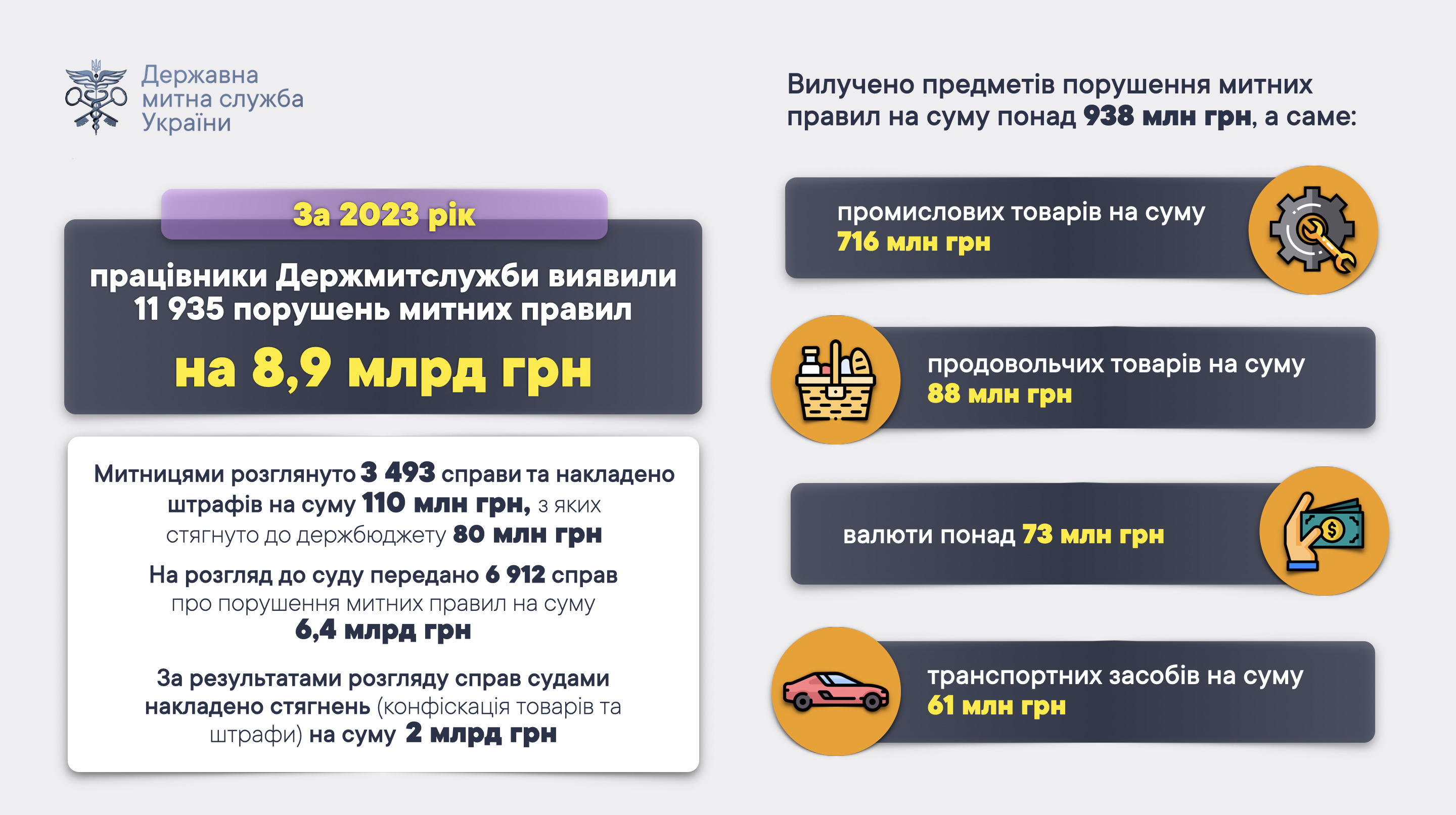 Протягом січня-грудня 2023 року митниці Державної митної служби України виявили 11 935 порушень митних правил на суму 8,9 млрд грн. Порівняно з 2022 роком вартісний показник збільшився у три рази.