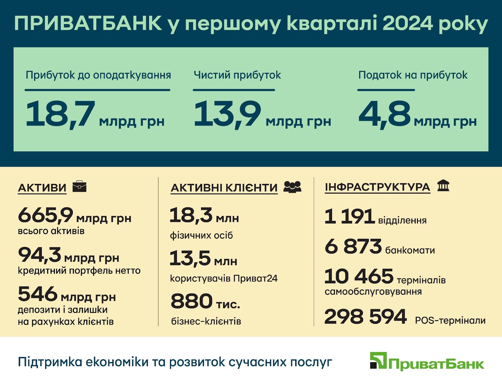 Державний "Приватбанк" за підсумками роботи у першому кварталі 2024 року отримав 13,86 млрд грн чистого прибутку, що на 14% менше, ніж за аналогічний період минулого року.