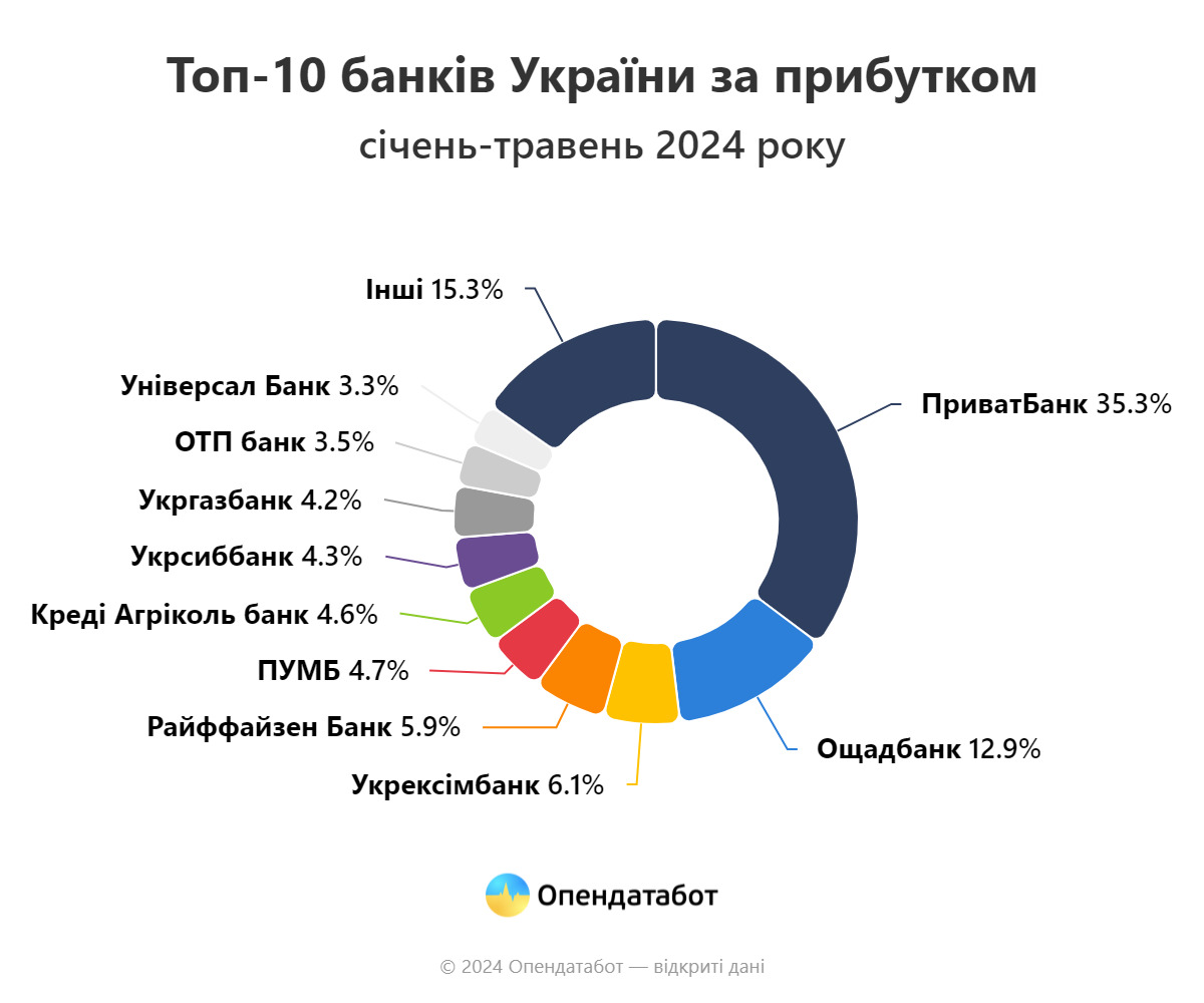 35% прибутку усіх банків припадає на державний "Приватбанк". За п’ять місяців банк отримав 23,96 млрд грн прибутку після оподаткування. Проте це на 6% менше, ніж за аналогічний період минулоріч. Загалом саме "Приватбанк" сплатить майже половину від суми податків усіх банків країни за цей час – 8,04 млрд.