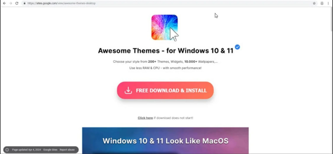 Відтак, найпопулярнішими є рекламні пости, які пропонують користувачам можливості кастомізації Windows. Коли користувачі переходять за посиланням у рекламних постах, їх перенаправляє на сайти, розміщені на Google Sites або True Hostings, де пропонують безплатно завантажити різного роду програми.