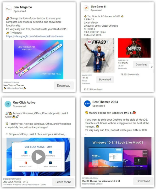 Шахраї створюють у соціальній мережі нові бізнес-акаунти та розповсюджують рекламу фейкових тем для Windows 10 і 11, піратських ігор та програм, на кшталт Adobe Photoshop чи Microsoft Office, разом із якими встановлюють шкідливе ПЗ.