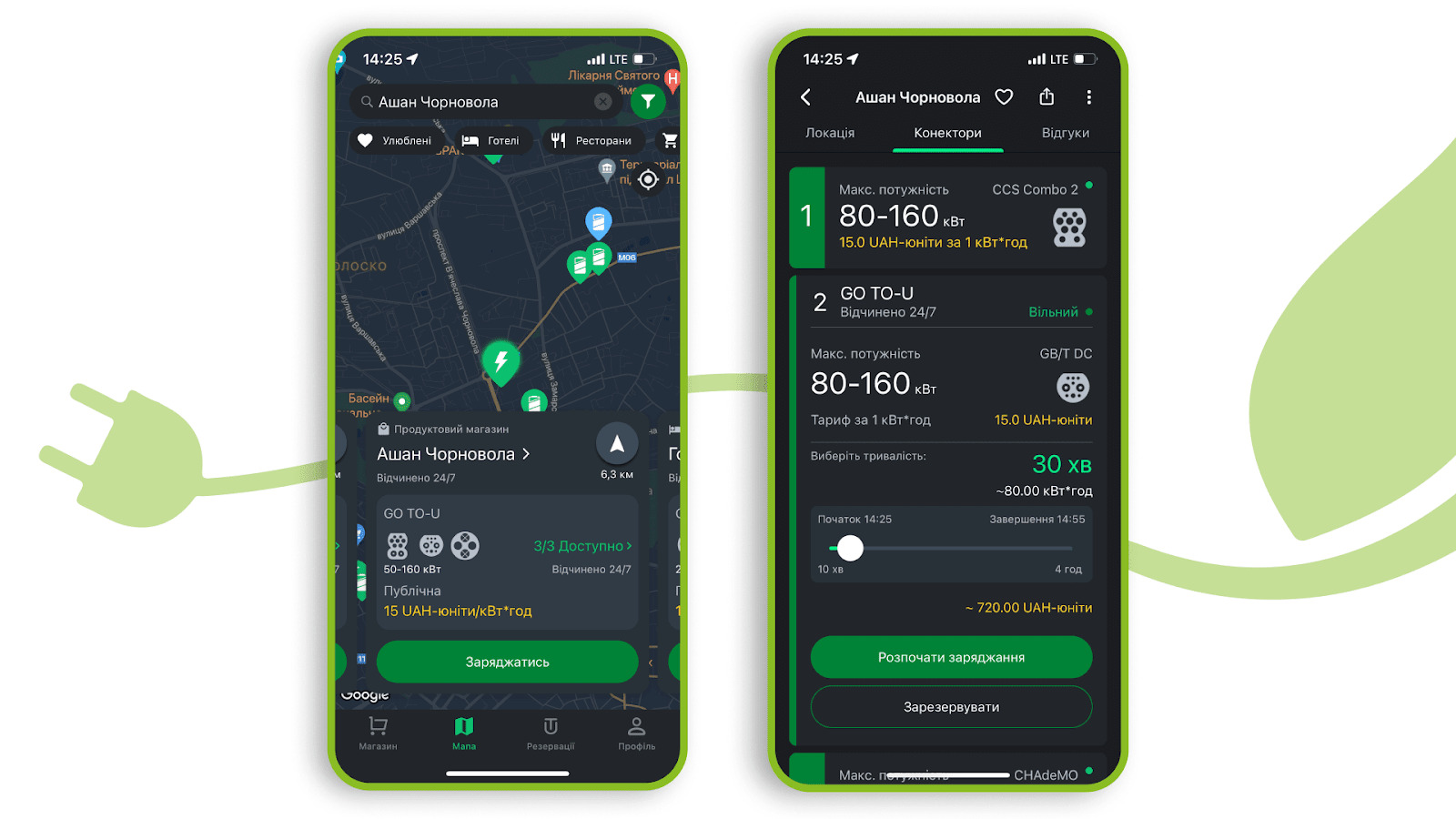 - можливість резервації конектора на необхідний день та час завдяки унікальній технології резервації, що дозволяє уникати черг на зарядній станції і спланувати свій час з точністю до хвилини;