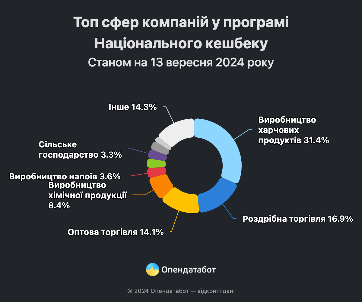 Загналом, станом на 13 вересня до програми "Національний кешбек" приєдналося 1 038 компаній та 167 ФОПів. Майже третина бізнесів задіяна у сфері виробництва харчових продуктів – 326. Ще майже 17% компаній займаються роздрібною торгівлею, оптова торгівля посідає третє місце з часткою 14%.