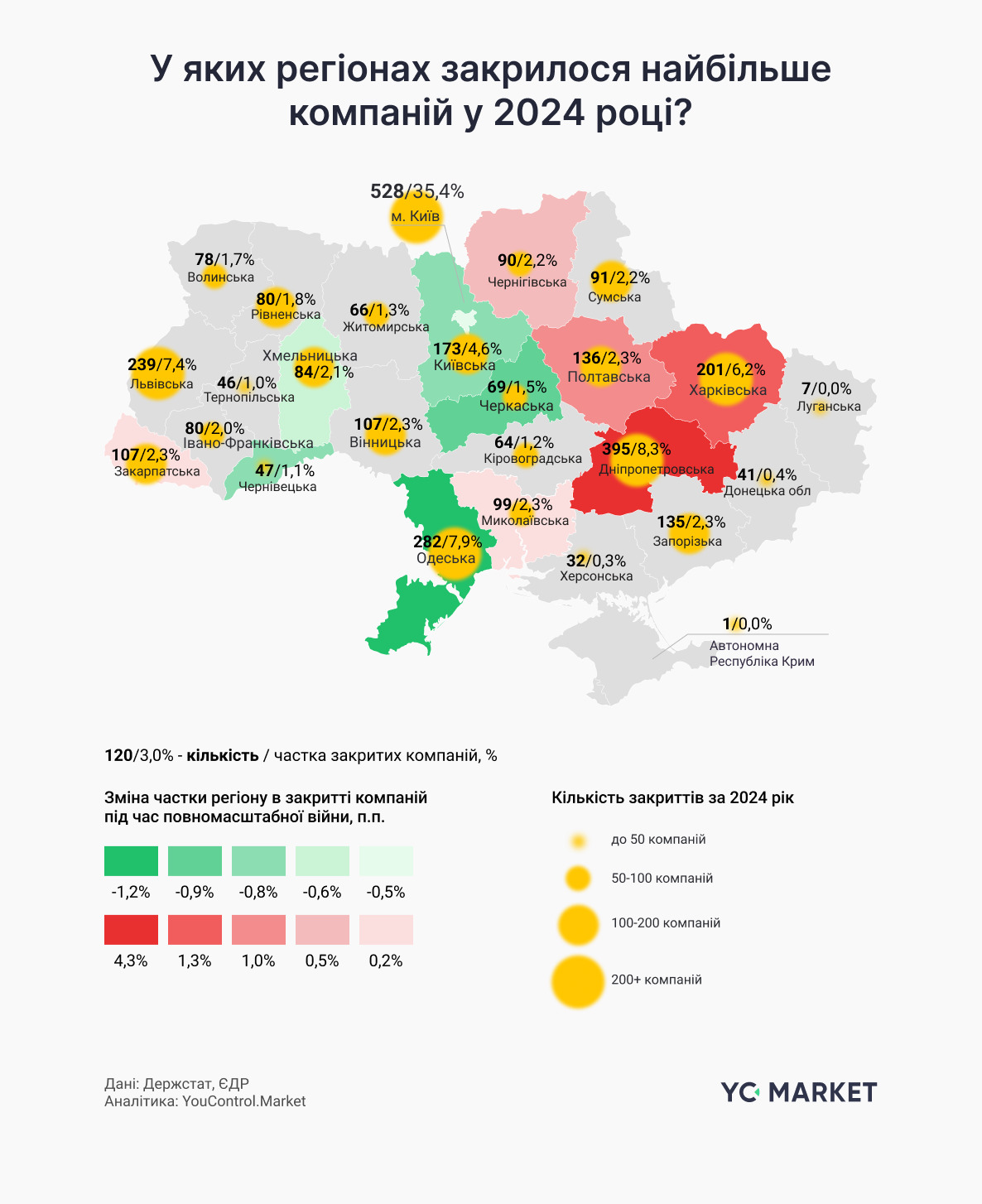 Найбільше закриттів компаній зареєстрували у Києві – 528, Дніпропетровській – 395 та Одеській області – 282. При цьому інтенсивність ліквідації підприємств у 2024 році зросла найбільше в Дніпропетровській, Харківській та Полтавській областях.