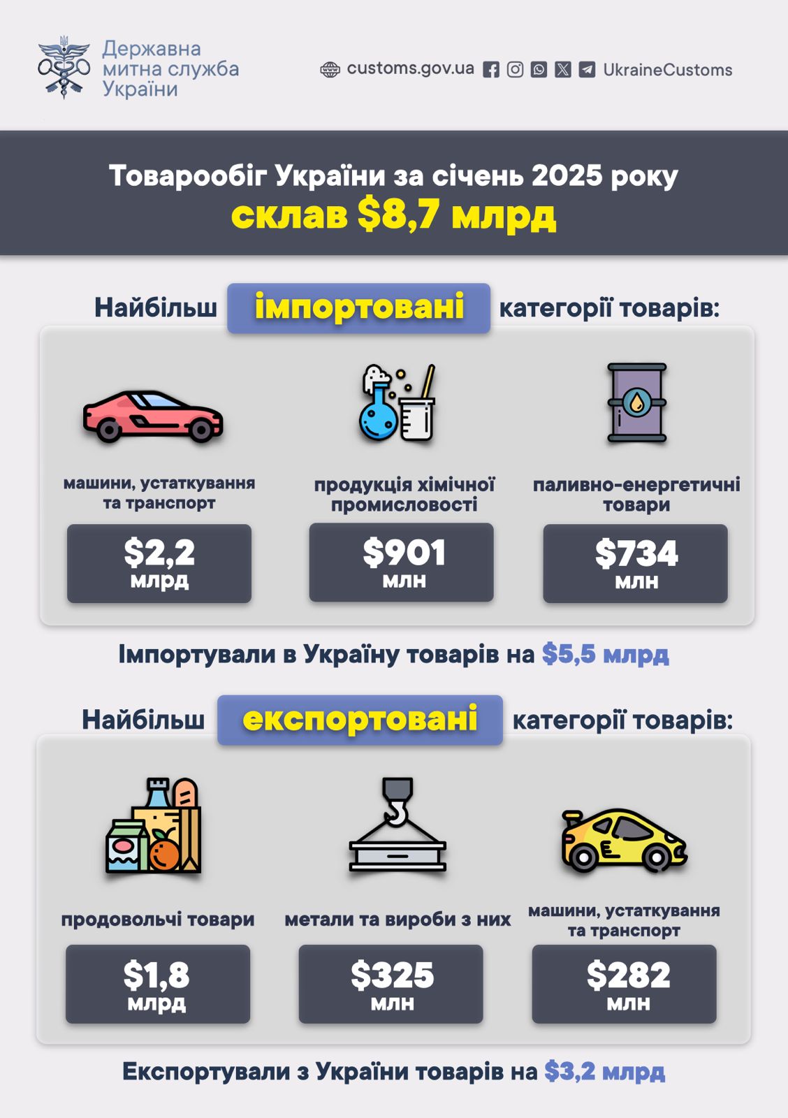 Протягом січня 2025 року в Україну імпортували товарів на суму $5,5 млрд, а експортували – на $3,2 млрд.