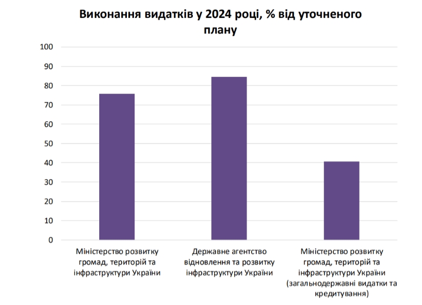 За підрахунками експертів, недофінансування відбулося за всіма профільними розпорядниками коштів: Агентство відновлення профінансувало тільки 78% планових видатків на відбудову, Мінрозвитку – 70% за програмами відбудови і 40% за загальнодержавними програмами.