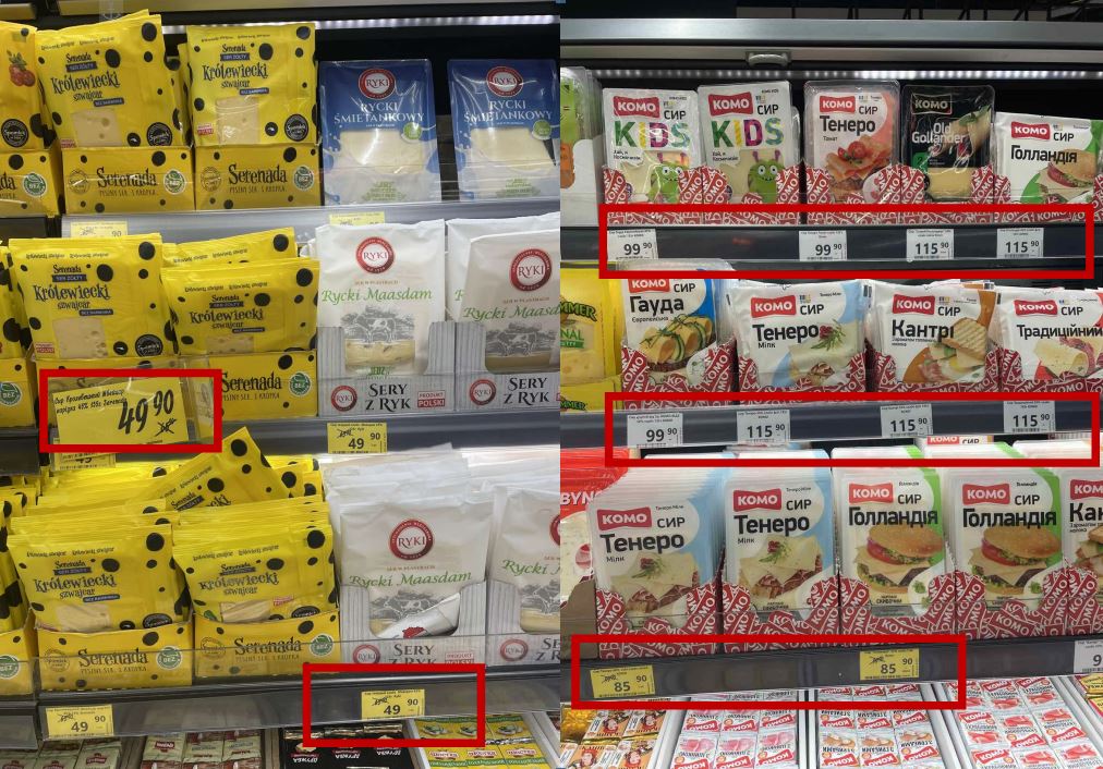 Як приклад, наводиться прилавок луцької мережі "Там-там", де в березні польський сир коштував удвічі менше за український – 49,90 грн проти 99,90 грн, а подекуди й 115,90 грн за 135 грамів.
