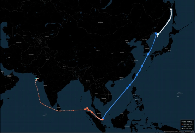 Night Glory транспортувала вантаж до узбережжя Малайзії, де нафту перевантажили на судно Cordelia Moon, яке у підсумку і доставило сировину на нафтопереробний завод "Джамнагар" у Західній Індії наприкінці травня. Night Glory та Cordelia Moon перебувають під санкціями Великої Британії, але не США.