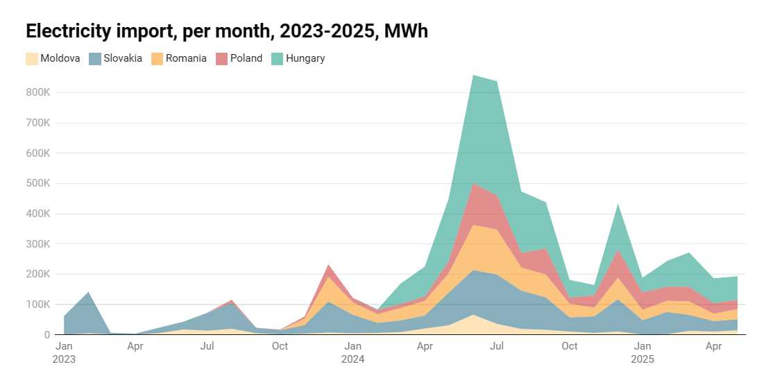 У 2024 році Україна збільшила імпорт електроенергії в 5,5 раза – до 4,4 млн МВт-год. Найбільше у структурі імпорту електроенергії зайняли Угорщина – 39%, Словаччина – 23%, Румунія – 18%, Польща – 14% та Молдова – 5%.