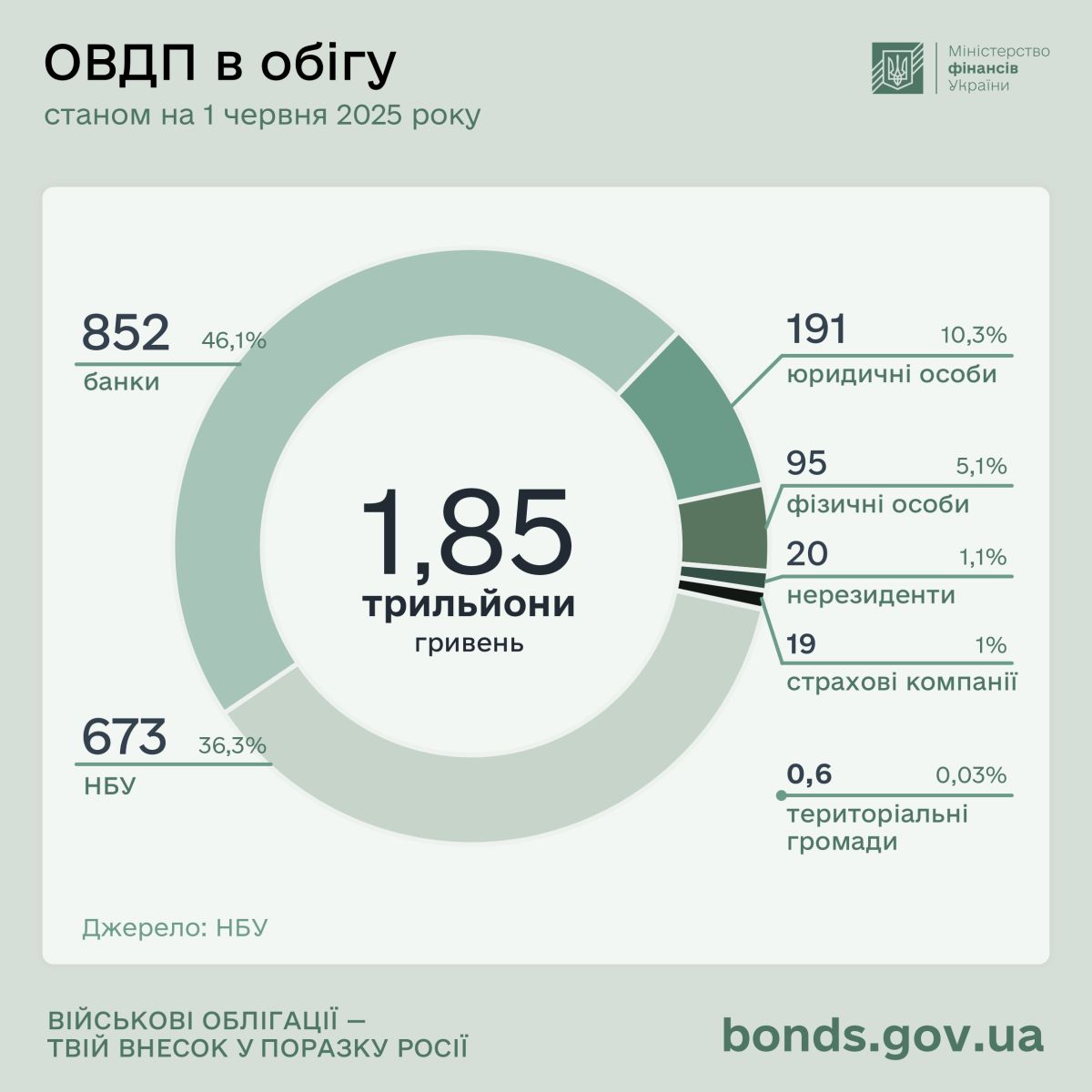 Станом на 1 червня в обігу перебувають ОВДП на понад 1,85 трлн грн. Найбільша частка знаходиться у комерційних банків (46,1%) та Національного банку України (36,3%).